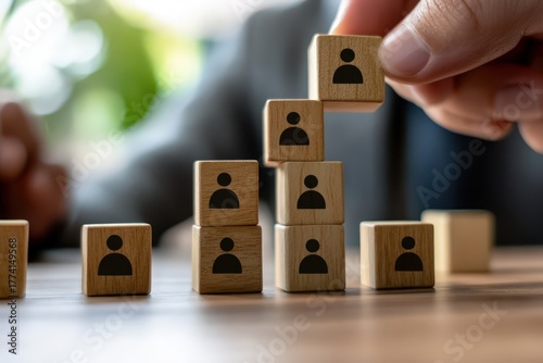 Building the team : A hand strategically positions wooden blocks, each representing an individual. This symbolic scene, focusing on concept, captures the essence of teamwork and strategic planning