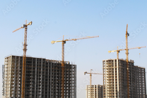 building under construction, construction site with crane and blue sky