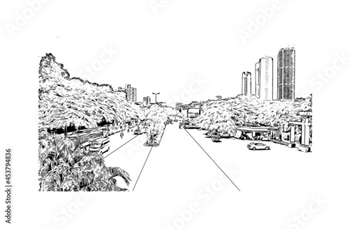 Building view with landmark of Hanoi is the capital in Vietnam. Hand drawn sketch illustration in vector.