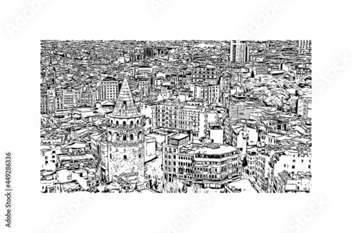 Building view with landmark of Istanbul is a major city in Turkey. Hand drawn sketch illustration in vector.