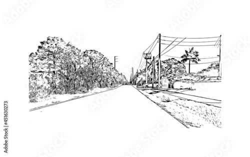 Building view with landmark of Jupiter is the town in Florida. Hand drawn sketch illustration in vector.