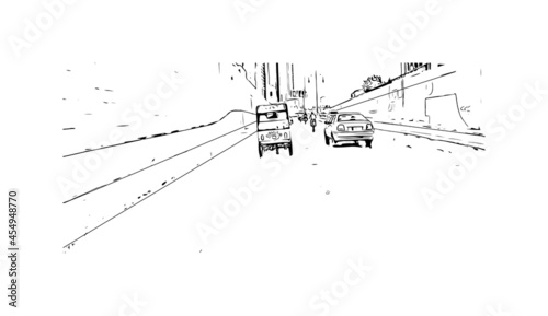 Building view with landmark of Karachi is the largest city in Pakistan. Hand drawn sketch illustration in vector.