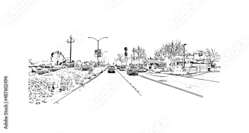 Building view with landmark of Merced is the city in California. Hand drawn sketch illustration in vector.