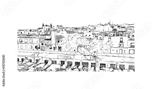 Building view with landmark of Porto Colom is a smallish town in Mallorca. Hand drawn sketch illustration in vector.