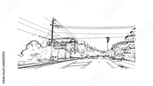 Building view with landmark of Siesta Key is a barrier island in Florida. Hand drawn sketch illustration in vector.