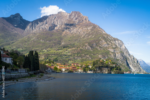 Buildings of the city of Lecco on the shores of Lake Como surrounded by mountains in the background. Sailboats on the waters of the lake and the waterfront.