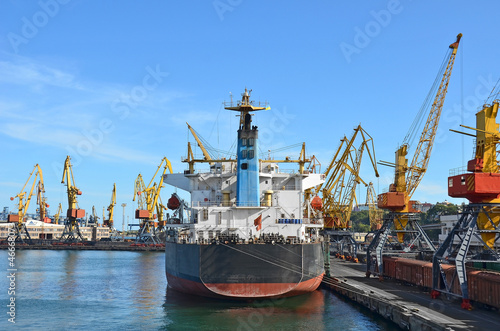 Bulk cargo ship under port crane bridge, Odessa, Ukraine