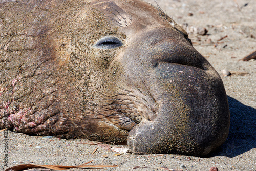 Bull Elephant Seal resting on a sandy beach at the Piedras Blancas Elephant Seal Rookery