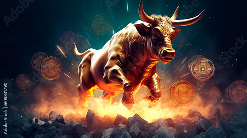 bull market, a green bull powerfully runs through a narrow street, high concentration as a strong will in the eyes of the bull, concept of business and stock market created with Generative Ai