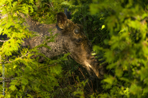 Bull Moose Grazing (Alces alces) in trees, Algonquin Provincial Park, Ontario, Canada
