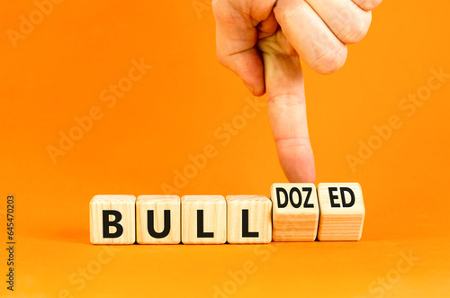 Bull or bulldozed symbol. Businessman turns wooden cubes and changes word Bull to Bulldozed. Beautiful orange table orange background. Business bull or bulldozed concept. Copy space.