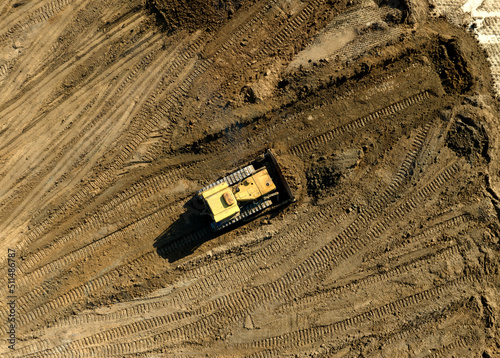 Bulldozer at mine reclamation once mining sand is completed. Land clearing, grading, pool excavation, utility trenching. Dozer during Road construction on construction site.