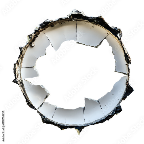 Bullet hole with cracked, jagged edges, cut out, transparent background