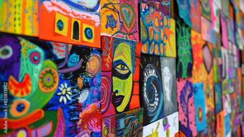 Bulletin board filled with colorful artwork and various announcements, close-up, capturing the vibrant spirit of creativity and expression