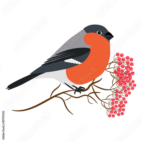 Bullfinch isolated on white vector. Sitting at a rowanberry