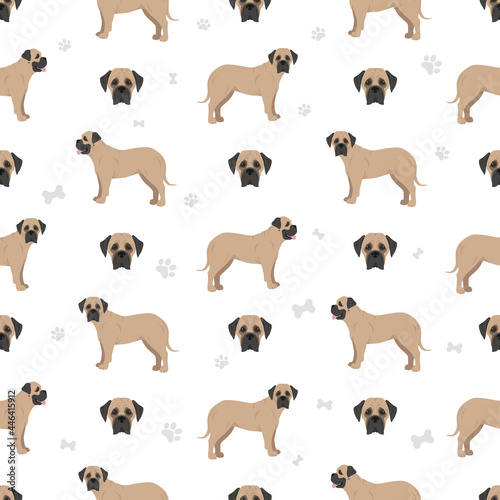 Bullmastiff seamless pattern. Different coat colors and poses set