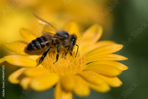 Bumblebee in the garden close-up. Cute beautiful flowers in the garden close-up. Selective small focus and nice bokeh. Fairytale world of plants. Nature green and vibrant petals.