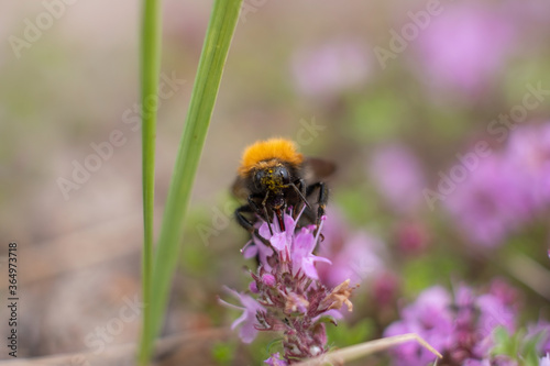 Bumblebee pollinates a flower on summer day. Close up view