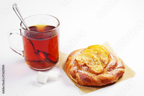 Bun with apples and tea