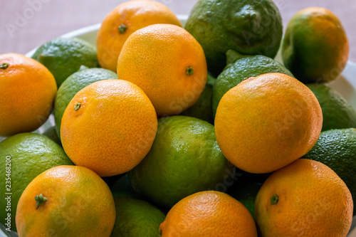 Bunch of Fresh Citrus. Mandarin Orange. Green Lemon