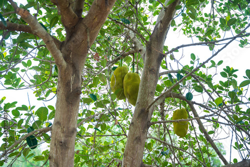 bunch of Jack fruits in tree. Green Tropical fruits in the tree.