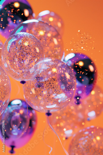bunch of transparent glittery balloons floating on a pastel orange background, with purple and black colors creating a dreamlike atmosphere, autumn halloween party decorations with copy space