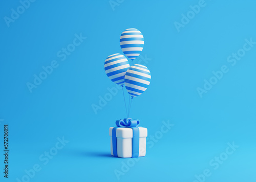 Bunch of white and blue striped balloons with white gift box on blue background. 3d render illustration