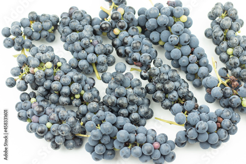 bunches of blue grapes on a white background. Harvest of wine berries on the table. Top view photo