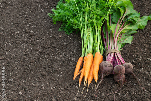 Bunches of freshly harvested carrots and beetroots on the soil