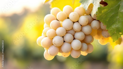 Bunches of plump and juicy white grapes hanging on the vine, surrounded by vibrant green leaves, illuminated gently by soft sunlight, perfect for conveying freshness and nature.