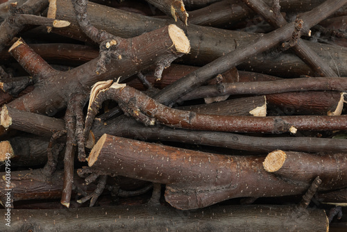Bundle of dry sticks and branches. Dry brushwood. Firewood. Large pile of sticks twigs of a tree.