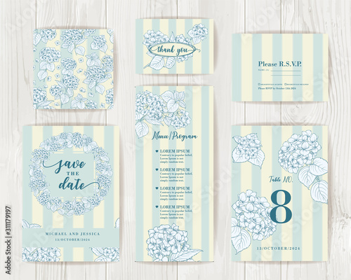 Bundle of Save The Date and RSVP Invitation Card. Coctail party invitation card with blue flowers of hydrangea on tile background. Set of Floral vertical templates with garden blooming flowers
