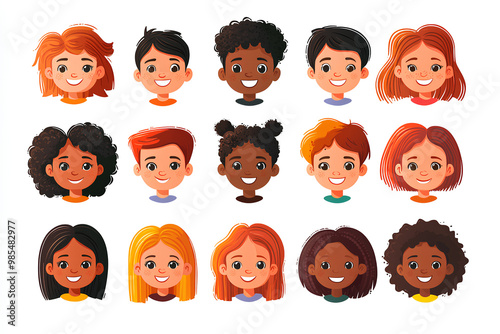 Bundle of smiling faces of boys and girls with different hairstyles, skin colors and ethnicities. Colorful flat vector illustration isolated on white background