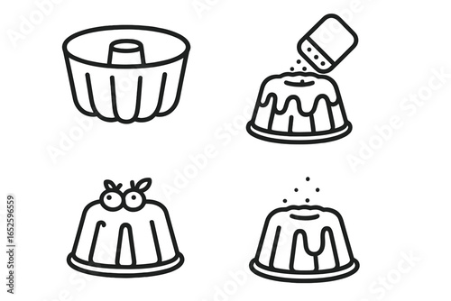 Bundt cake baking outline icon set. Vector line art of dessert preparation, including bundt pan, glaze drizzle, fresh berries, and powdered sugar shaker for decoration.