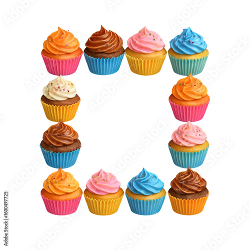 Bunte Cupcakes bilden einen quadratischen Rahmen, perfekt freigestellt mit transparentem Hintergrund. Ideal für Scrapbooking, Deko oder digitale Designs.
