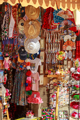 Bunter Marktstand voller Kleidung, Hüte und Souvenirs in Farben