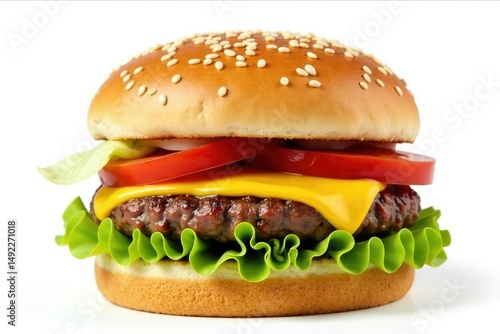 Burger on sesame bun, isolated white background , hamburger, burger joint, isolated