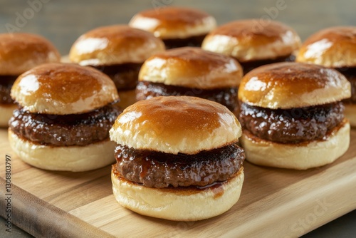 Burger Sliders. Beef Patty on a Brown Bun with Colorful Toppings on Chopping Board