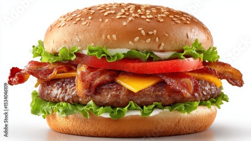 Burger with Bacon, Cheese, Tomato, and Lettuce on Sesame Seed Bun