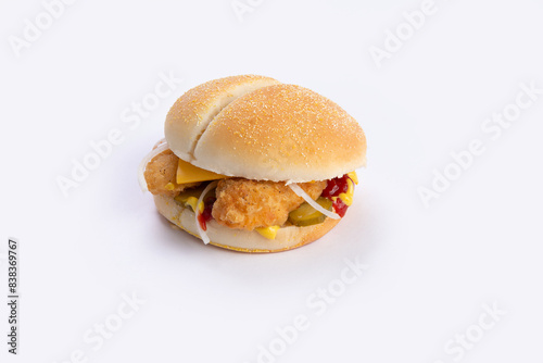 Burger with chicken strips, lettuce and cheese. Isolated on white.