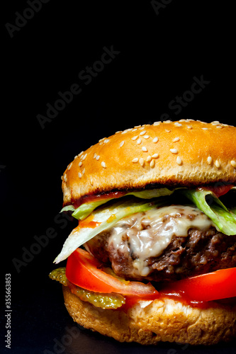 burger with chop, steak, cheese, salad on a black background