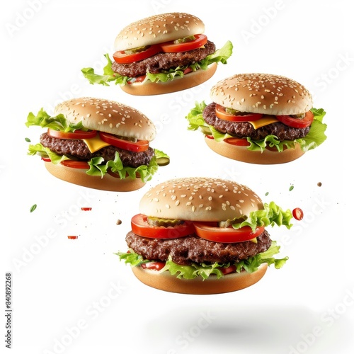 Burgers flying through the air against a white background