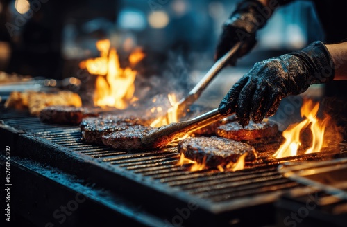 Burgers grilling with flames and tongs