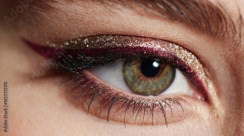 Burgundy winged eyeliner glitter gold eyeshadow beauty eye makeup closeup macro warm bokeh party festive sparkle clean neutral