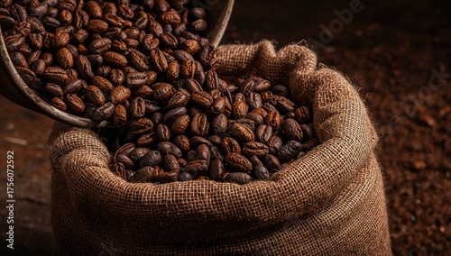Burlap sack filled with freshly poured cocoa beans