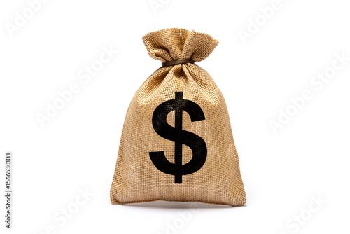 Burlap Sack Full of Money with Black Dollar Sign on Clean White Background