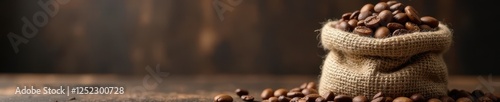 Burlap sack of coffee beans against dark wood background, organic, rustic