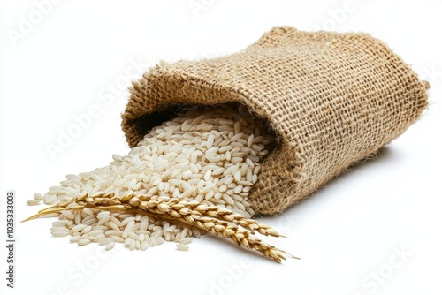 Burlap Sack with Spilled White Rice and Wheat Spikes