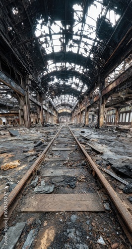 Burned-out factory, railway tracks