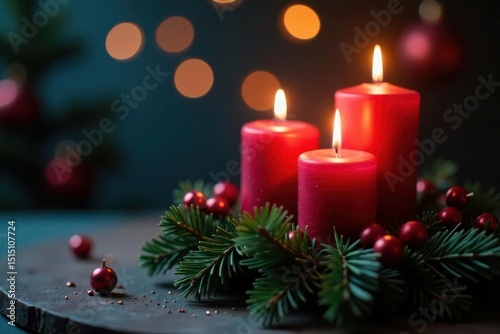 Burning advent candles illuminate a cozy pine and glitter wreath , holiday spirit, close-up